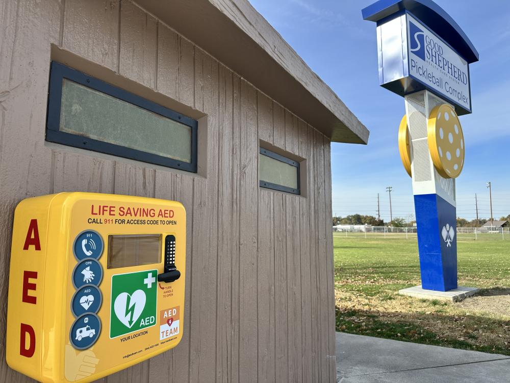 The AEDs at the Good Shepherd Pickleball Complex and Funland Playground are housed in outdoor cabinets with a locking code. During a medical emergency, individuals can call 911 to receive the access code, enabling them to administer aid using the AED while emergency responders are on the way. The AED at the HEROS Sportsplex will be unlocked and available during scheduled activities.